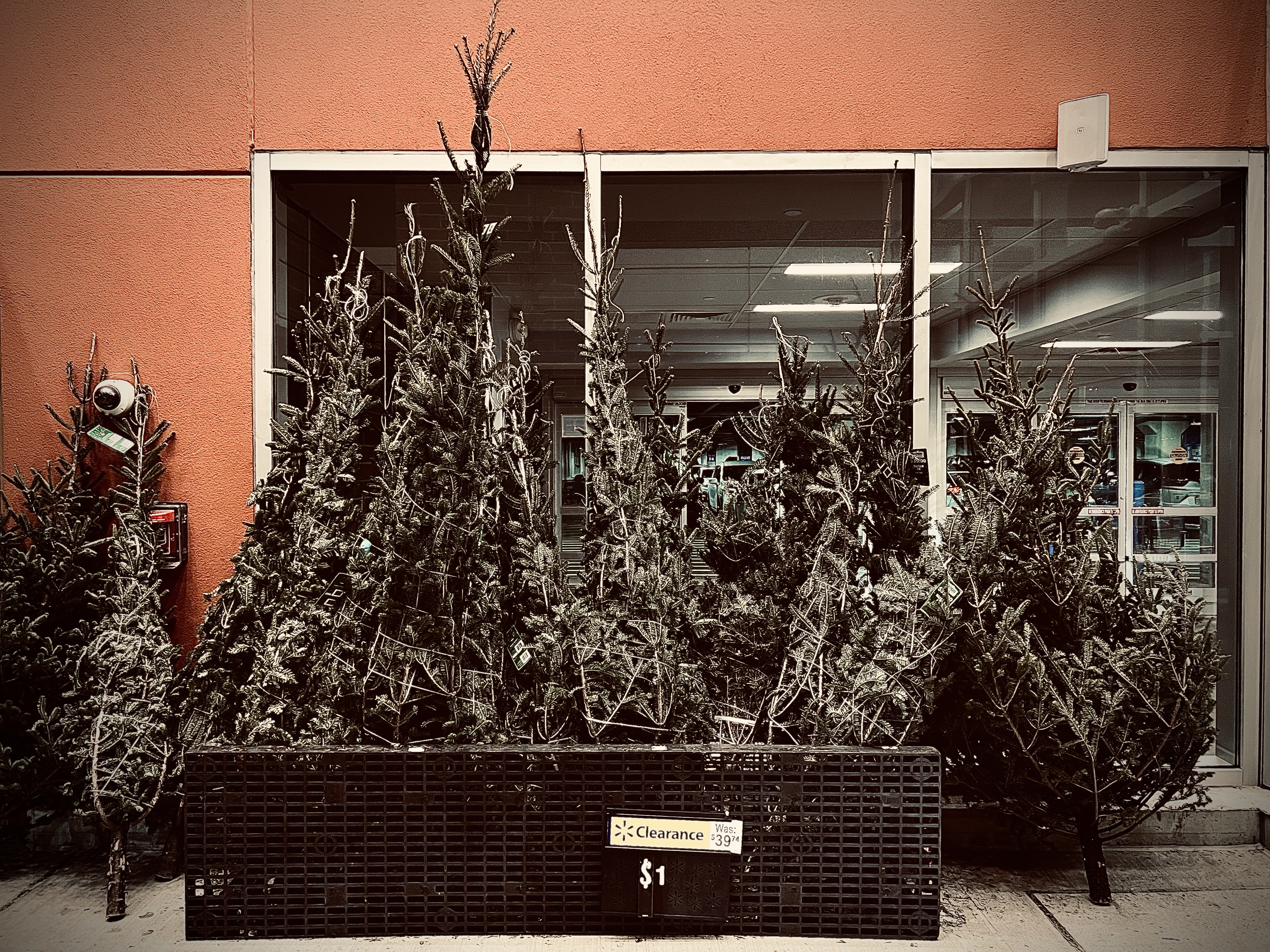 The last Christmas trees in the bin stood gazing around. They were barer by the day, dry as the Gobi, and you could take one home for the low deal of one whole dollar.