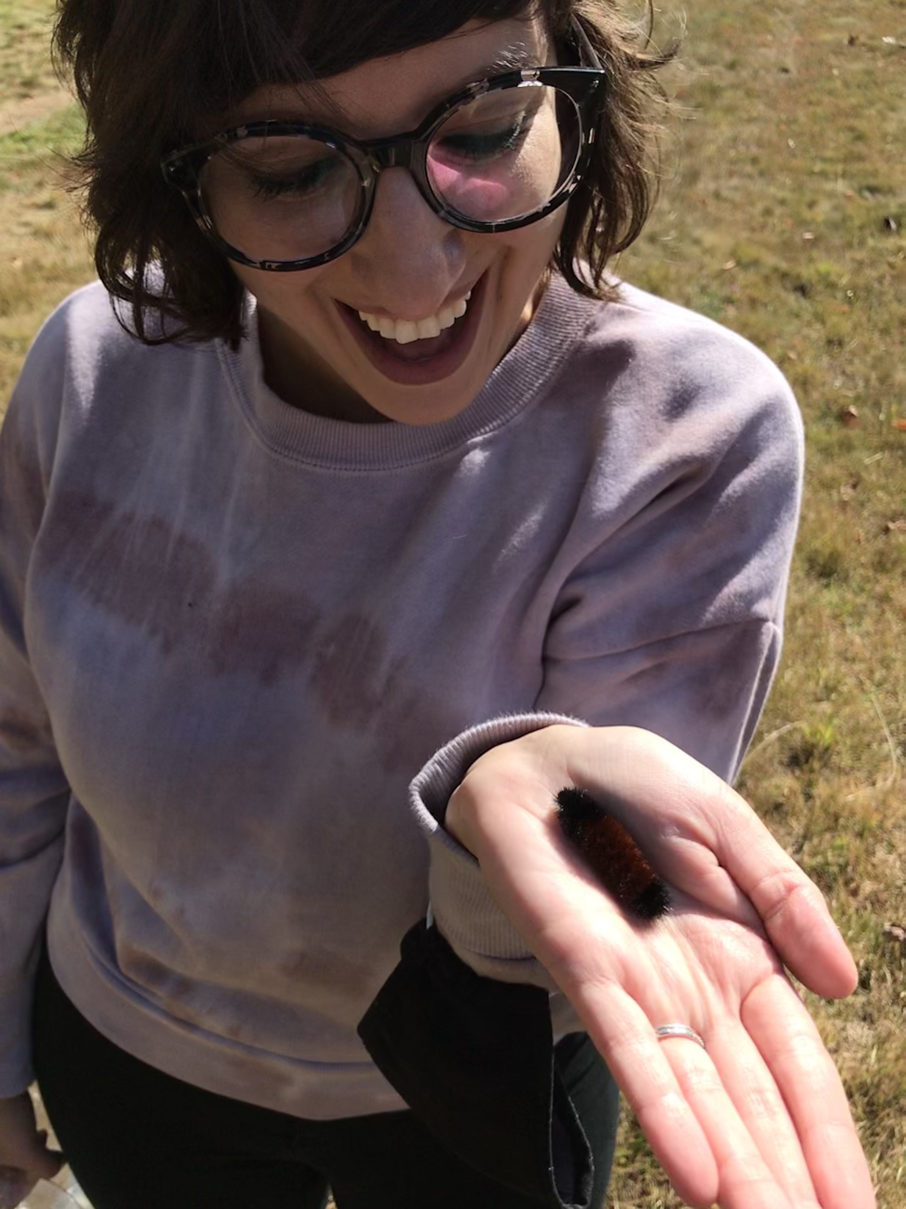 We watched a woolly caterpillar, dressed in black and ruddy orange fuzz, slink its way across the trail.